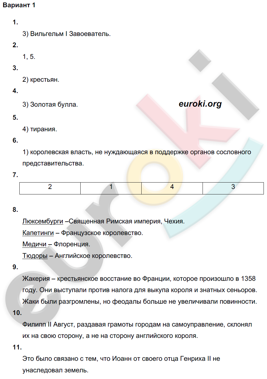 Ключи к контрольной работе для 6 класса по истории Средних веков.