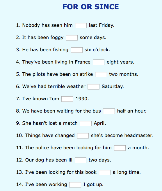 Еще несколько упражнений на since и for Вы можете найти в статье упражнения на Present Perfect.